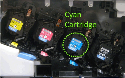 - If the issue is not resolved or the issue shown above did not occur at first installation, the cyan print cartridge is damaged. Replace the cyan print cartridge with a new cyan print cartridge. Show me how.